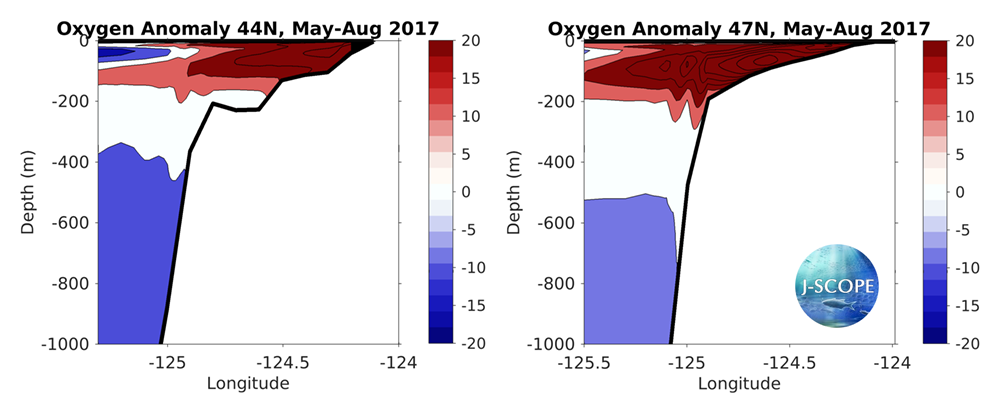 Finally, climatological cross-sections from the Newport Line in Oregon (44°N) and the Grays Harbor Line in Washington (47°N) are compared to the forecasted average of the ensemble members during the summer upwelling season (May - August). In Oregon, the forecast projects that the oxygen concentration for the upwelling season of 2017 will be higher than the climatology subsurface (>400 m depth) and lower than the climatology on the shelf (<200 m depth). In Washington, the forecast projects that the oxygen concentration for the upwelling season of 2017 will be higher than the climatology on the shelf (<200 m depth), but lower than the climatology at deeper depths (>500 m).
