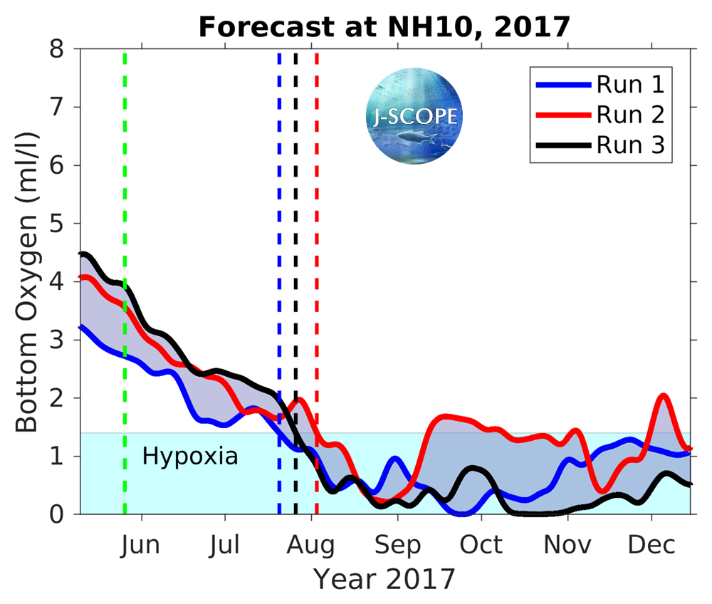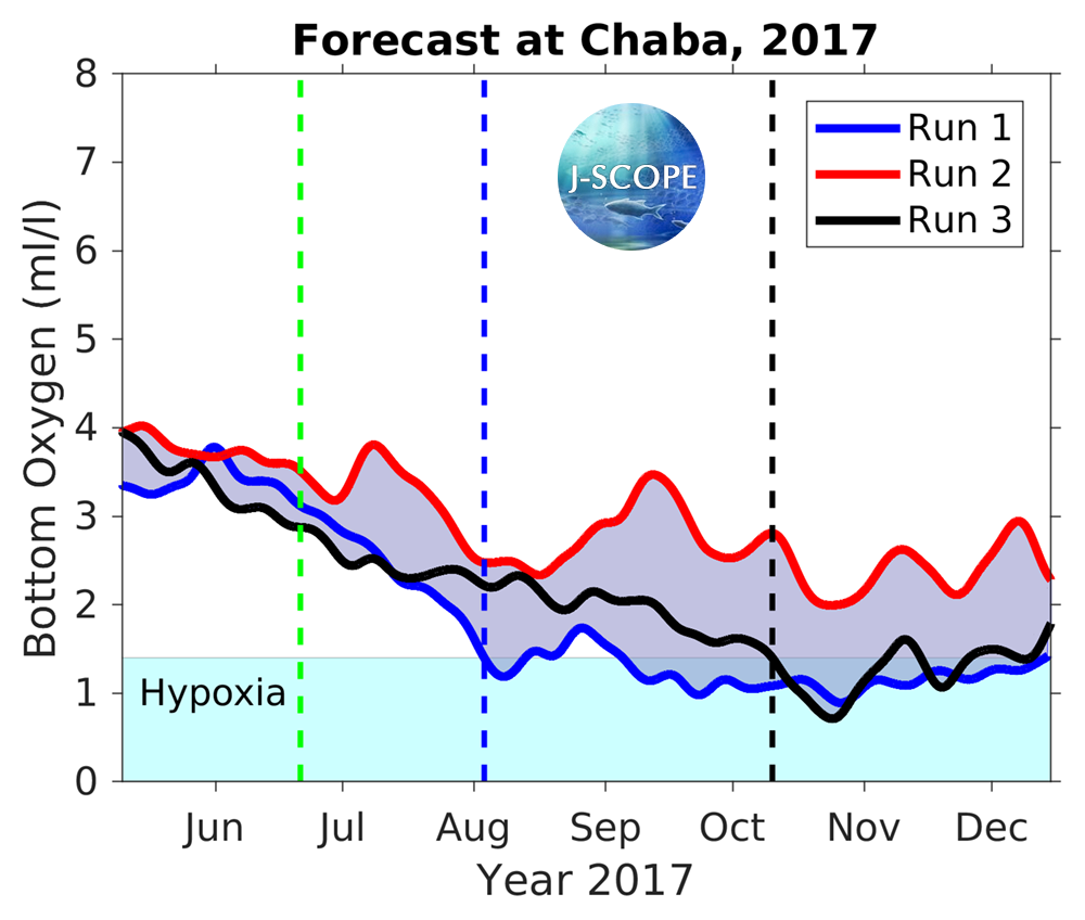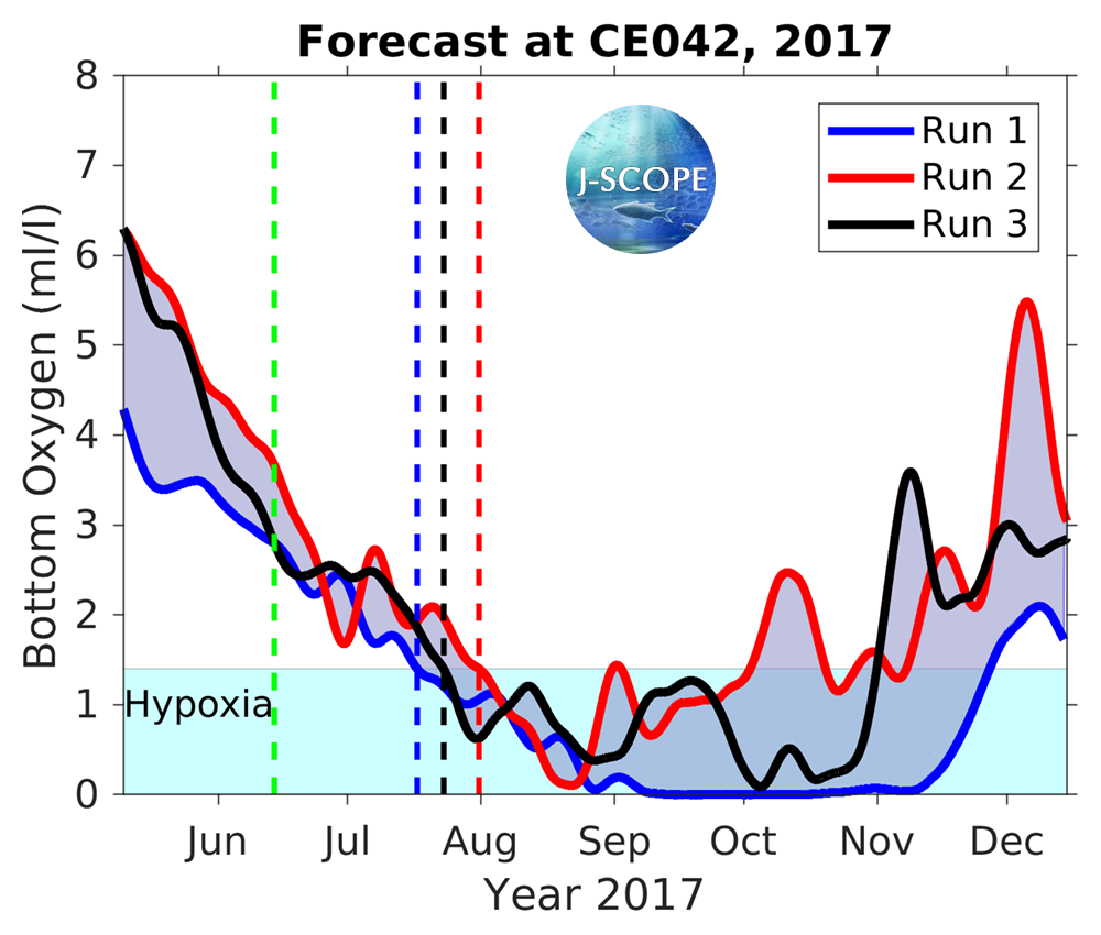 Time series of bottom oxygen from the Washington coast near one of the Olympic Coast National Marine Sanctuary (OCNMS) moorings at Cape Elizabeth (site CE042), from NH-10 mooring off of Newport, Oregon, and from the Ćháʔba· mooring off of La Push, Washington, are shown for each member of the ensemble. The model forecasts that hypoxia will most likely develop at the NH-10 and CE042 moorings in late July, which is about one month later than the climatological onset of hypoxia. Another time series from the outer Washington shelf, Ćháʔba·, forecasts hypoxia onset in two of the three ensemble members between August and mid-October at this location.
