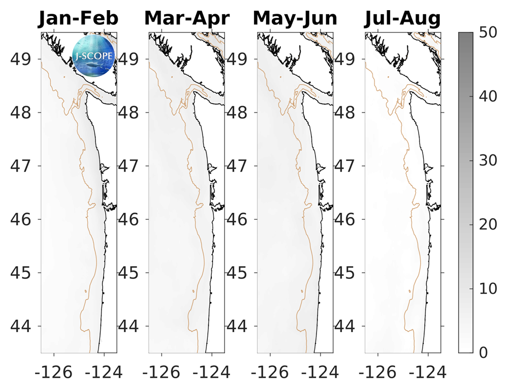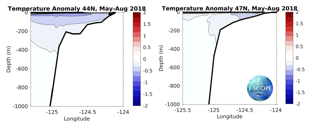 Finally, climatological cross-sections from the Newport Line in Oregon (44°N), as well as the Grays Harbor Line in Washington (47°N), are compared to the forecasted average of the ensemble members. The forecast projects that although SST is projected to be slightly higher than climatology (0-20 meter depth), the subsurface waters are forecasted to have temperatures for the upwelling season of 2018 that are slightly lower than the climatology in both Washington and Oregon.