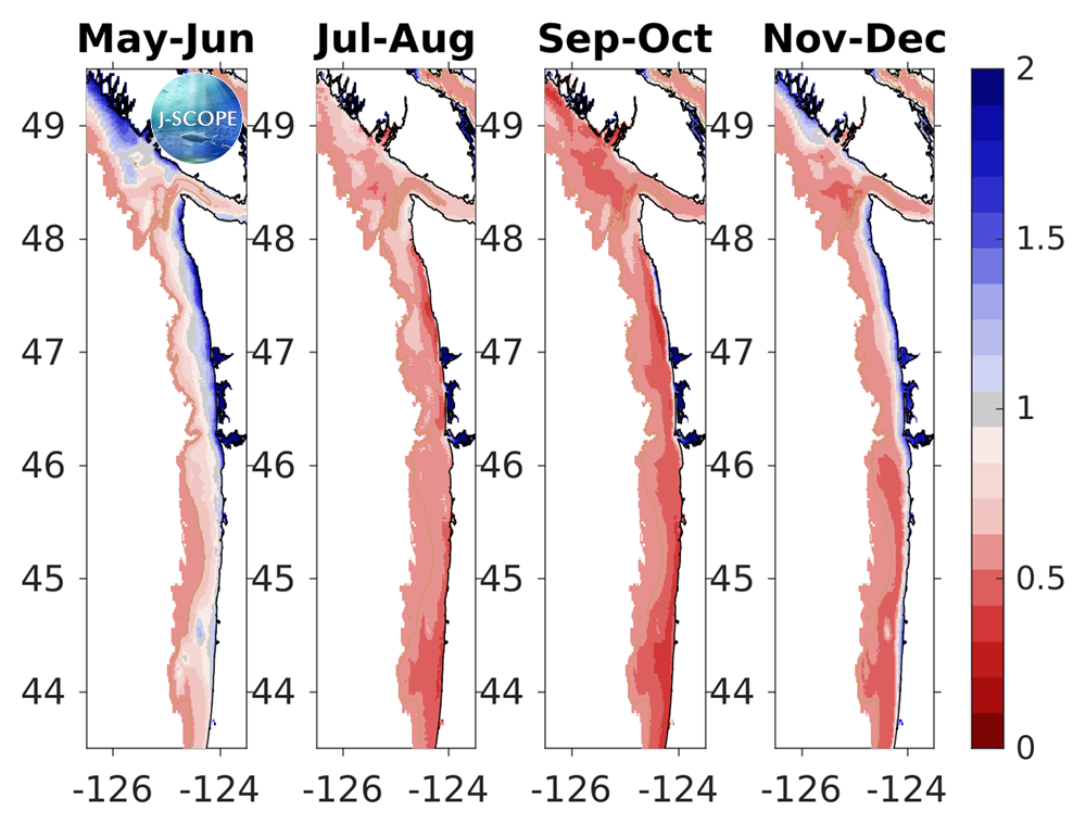The movie above shows the J-SCOPE forecast for 2018, from ensemble model run 3 initialized on April 25. The 8-day upwelling index is calculated using the method described in Austin and Barth (2002) and can also be found under the California Current Indicators tab above.