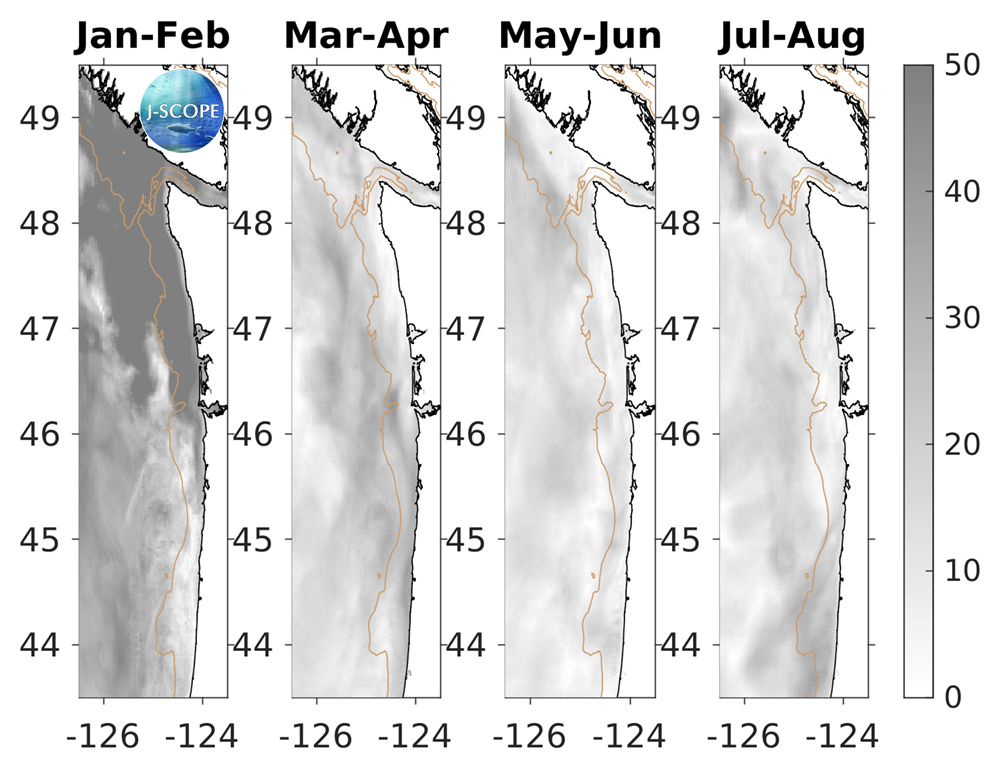 For waters off the Washington and Oregon coast, the forecast projects that 10-meter integrated chlorophyll will be slightly lower than climatology on the shelf and lower than climatology farther offshore at the beginning of the upwelling season (May - June). However, later in the upwelling season (July - August), shallow shelf waters will have higher chlorophyll than climatology while offshore waters will approach climatology. The relative uncertainty is highest at the beginning of the forecast when chlorophyll levels are low, but then decreases and remains relatively steady throughout the upwelling season.