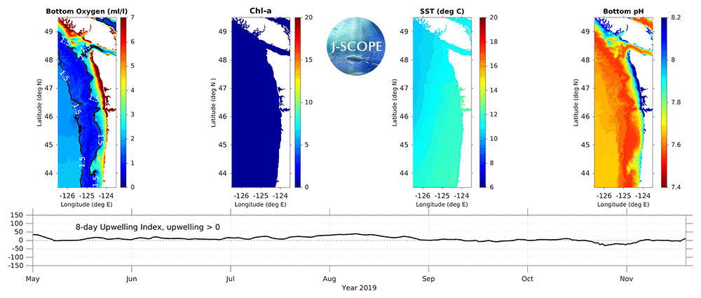 The J-SCOPE forecast system for Washington and Oregon coastal waters presents preliminary results for the 2019 upwelling season. The CFS forecast indicates continued weak El Niño conditions throughout the summer, with more uncertainty surrounding the development of a strong El Niño condition versus a return to neutral conditions in the forecasts heading into the fall. In comparison to the climatological data, during the summer upwelling season (May - August), coastal regions are forecasted to have slightly higher sea surface temperatures (SST) with the warm anomalies extending subsurface. Bottom oxygen is forecasted to be lower than normal in the Washington and Oregon shelf waters over the upwelling season. Chlorophyll concentrations vary spatially but are forecasted to be slightly lower on the Washington shelf and over Heceta Bank early in the upwelling season, and near climatology over the rest of the upwelling season. Bottom Ω is forecasted to be undersaturated throughout the upwelling season, with the exception of supersaturated conditions on shallow nearshore Washington shelves early in the upwelling season. Surface Ω is forecasted to be supersaturated throughout the upwelling season for all coastal areas.