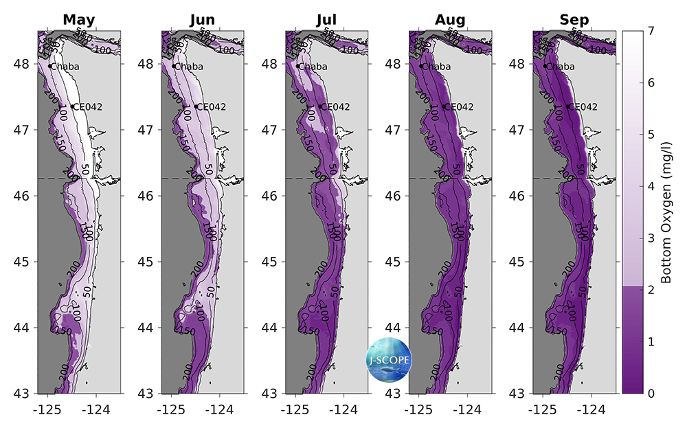 The modeled region bottom oxygen (mg/l) averaged over all three ensemble members and in time for (from left to right) May, June, July, August, and September. Hypoxia (O2 < 2 mg/l) is shown in dark purple, land is shown in light grey, and offshore areas are shaded dark gray. The black dashed line indicates the boundary between Washington and Oregon waters. Black contours indicate bathymetry on the shelf. Two mooring locations are plotted for reference (Ćháʔba·, CE042).