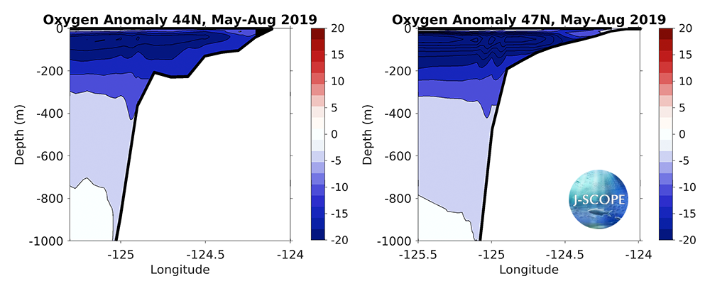 Finally, climatological cross-sections from the Newport Line in Oregon (44°N) and the Grays Harbor Line in Washington (47°N) are compared to the forecasted average of the ensemble members during the summer upwelling season (May - August). In both Oregon and Washington, the forecast projects that the oxygen concentration for the upwelling season of 2019 will be much lower than the climatology on both the shelf and at deeper depths, with the largest anomalies occurring between the surface and ~300 m depth in both Oregon and Washington.