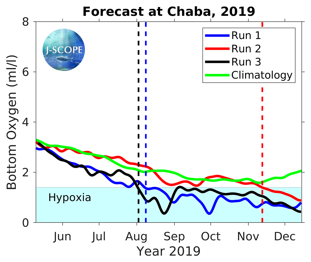 The emergence of anoxia in the model in late summer is caused by a bias associated with the lack of relaxations in the winds (found to be important in a paper by Adams et al, 2013) in the Climate Forecast System input files as well as a bias in the shortwave radiation (see 2013, Year in Review). The model does have skill in predicting the emergence and severity of hypoxia, while it is biased low for these reasons. Given the difficulty in predicting the fall transition in prior forecasts (see 2013, Year in Review), the forecast for low oxygen levels forecasted well into August is highly uncertain.