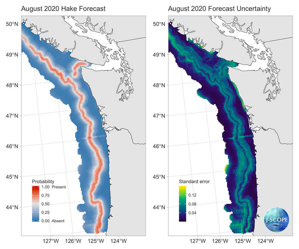 Right panel: Uncertainty associated with Pacific hake forecast for August 2020. Forecast uncertainty is higher in locations with brighter colors (yellow) and lower for darker locations (dark blue). Uncertainty tended to be highest in locations with bottom depths greater than 300 meters and lowest for areas nearshore and around the 200 meter shelf-break.