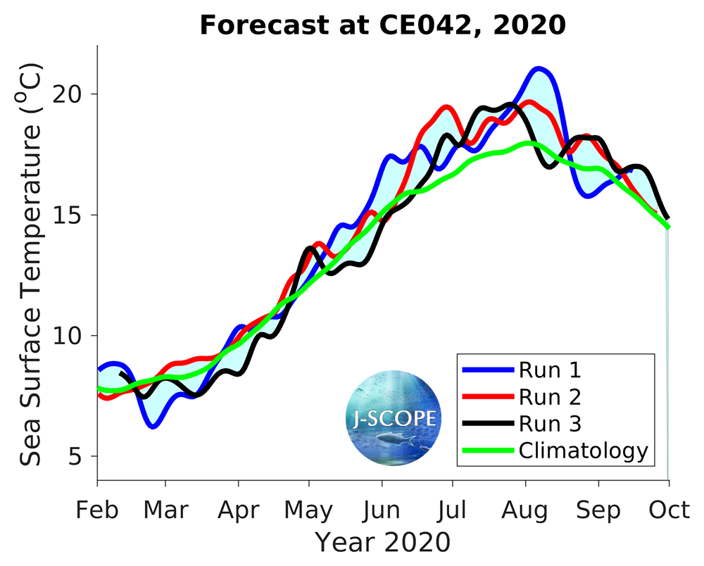 The SST was forecast using all three model runs of the ensemble for three point locations where buoys exist, Ćháʔba· off La Push, Washington, NH-10 off Newport, Oregon, and CE042 in the Olympic Coast National Marine Sanctuary, are shown below. All three indicate warmer SSTs than the climatology during most of the summer upwelling season.