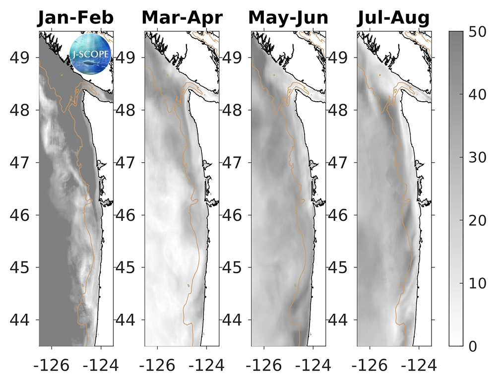 For waters off the Washington and Oregon coast, the forecast projects that 10-meter integrated chlorophyll will be lower than climatology, with exceptions of higher than climatology chlorophyll near the mouths of the Strait of Juan de Fuca and the Columbia River at the beginning of the upwelling season (May - June). Later in the upwelling season (July - August), the chlorophyll values near the outflow from the Strait of Juan de Fuca including the region associated with the Juan de Fuca Eddy and the Columbia River will continue to increase above climatology, while the remainder of the continental shelves and offshore areas are near or slightly lower than climatology. The relative uncertainty is highest at the beginning of the forecast when chlorophyll levels are low. Overall uncertainty is lower during the upwelling season, but it still varies spatially with uncertainty generally lower nearshore and higher around the shelf break.