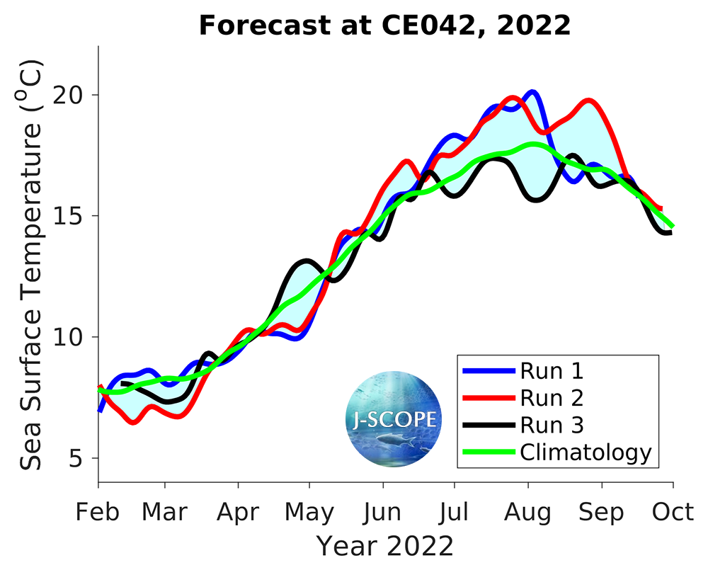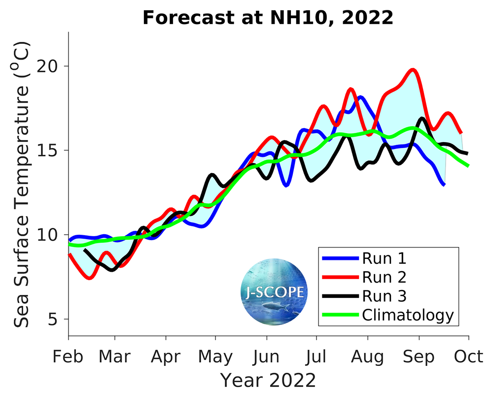 The SST was forecast using all three model runs of the ensemble for three point locations where buoys exist, Ćháʔba· off La Push, Washington, NH-10 off Newport, Oregon, and CE042 in the Olympic Coast National Marine Sanctuary, are shown below. All three indicate near climatological SSTs during the summer upwelling season.