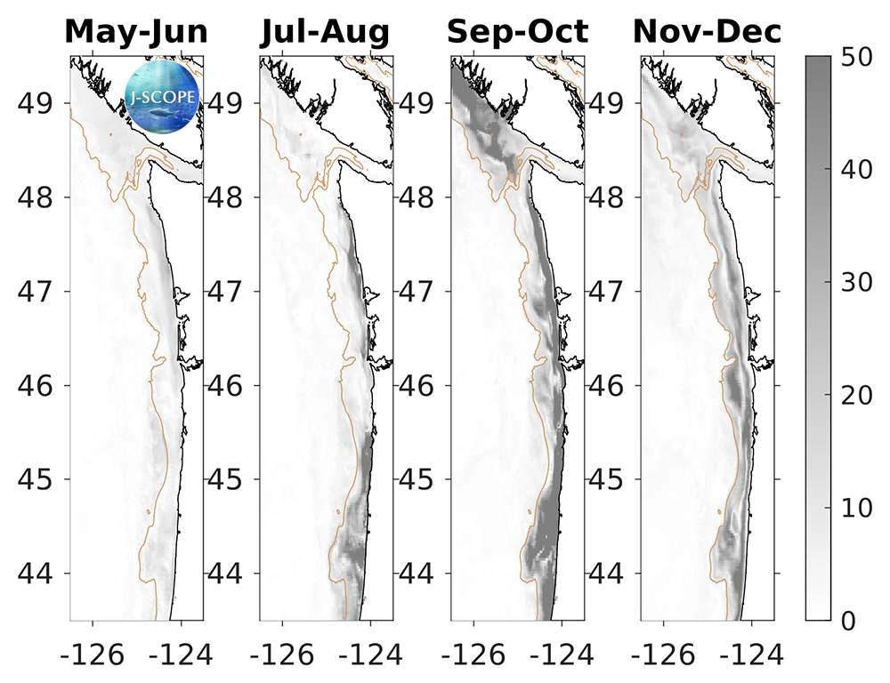 Hypoxia extends upward into the water column as well. The percentage of the water column that is forecasted to experience hypoxia (O2 < 2 mg/l) is a metric for this phenomenon. Early in the upwelling season, hypoxia is forecasted to occupy a small percentage of the water column over the entire modeled region (<10%). In July, some regions in Oregon, begin to experience more than ~20%. Over the course of the summer, the percentage of the water column that is hypoxic increases coast-wide, with particularly high volumes forecasted for Heceta Bank on the Oregon shelf and south of Cape Elizabeth in August and September with values exceeding 50% of the water column experiencing hypoxia.