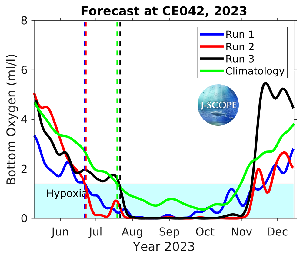 Time series for bottom oxygen at one of the Olympic Coast National Marine Sanctuary Moorings (CE042, ~47.5°N) for each of the 3 ensemble members. Hypoxia is outlined by the blue region on the plot. The timing of each run’s onset of hypoxic conditions for more than 8 days is identified by the vertical dotted lines, with the green line indicating the climatological timing.