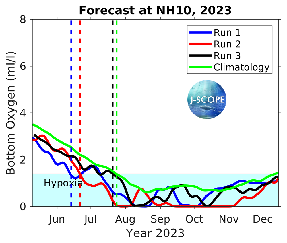 Time series for bottom oxygen at the NH-10 mooring in Oregon (~45°N) for each of the three ensemble members. Hypoxia is outlined by the blue region on the plot. The timing of each run’s onset of hypoxic conditions for more than 8 days is identified by the vertical dotted lines, with the green line indicating the climatological timing.