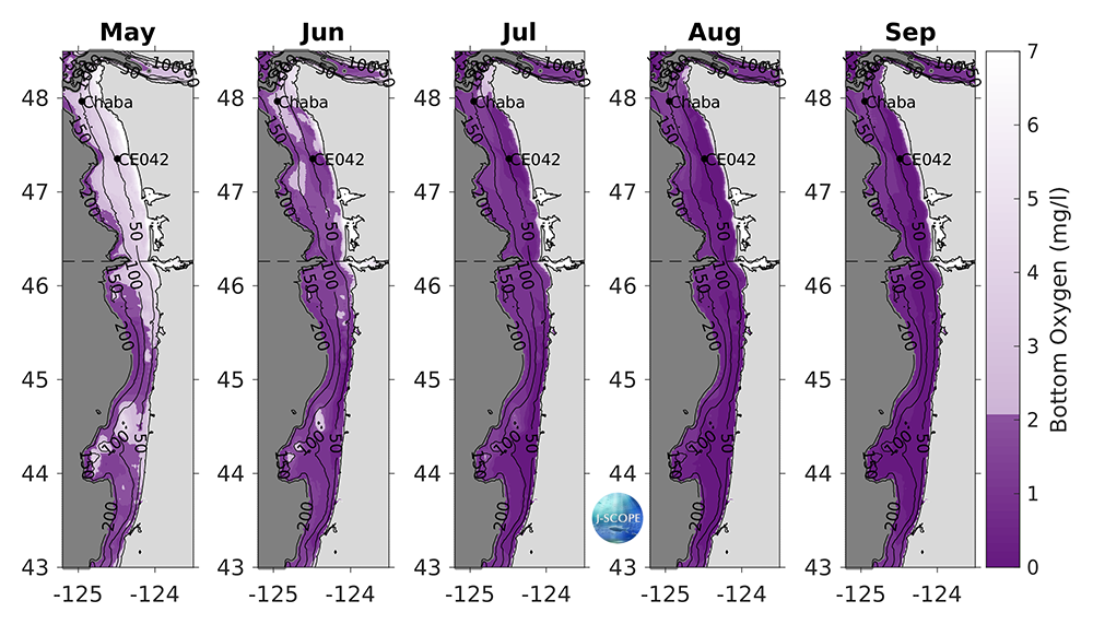 Forecasted bottom oxygen (mg/l), averaged over three ensemble members for each month, indicates declines in oxygen concentrations over the course of the forecast for both Washington and Oregon, with hypoxia (O2 < 2 mg/l) prominent over about half of the Oregon shelf in May and expanding to much of the Washington shelf in June and persisting through September eventually overtaking the typically normoxic region at the northern boundary of the Washington shelf around Chaba.
