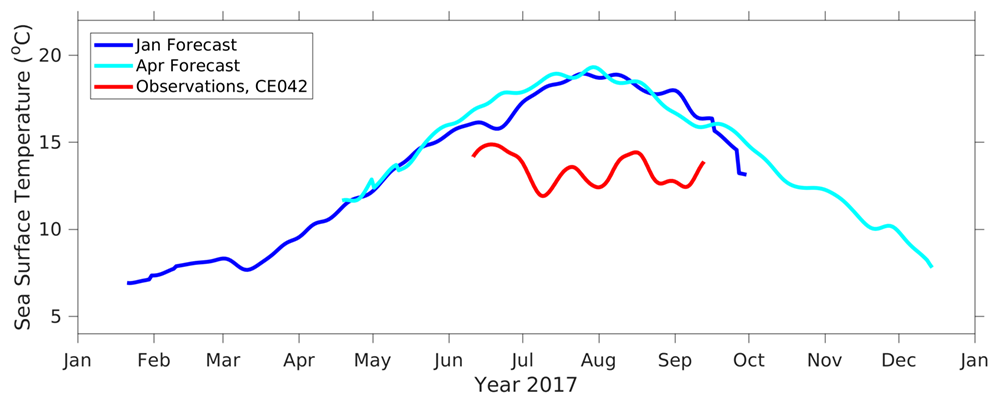 SST was biased high throughout the summer for both the January and April forecasts for 2017 compared to the observations at the OCNMS Cape Elizabeth mooring. On average, the model was ~5 deg C too warm. Forecasted bottom temperatures were also biased warm by 0.5-1 deg C at the same mooring.